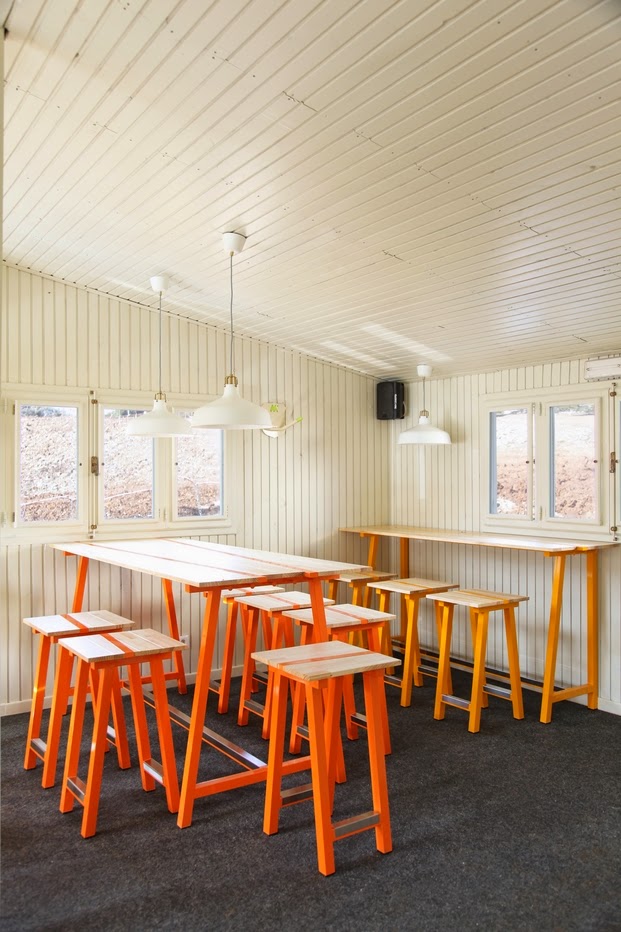El sencillo interior blanco con vistas a las pistas deja el protagonismo almobiliario, que soluciona todo el espacio. Realizado en madera, es el que permite trasladar nuestra imaginación a los años en que éramos niños. La gama de color, que va desde los tonos más cálidos, del rojo al naranja y amarillo, hasta llegar a los verdes, acentúa el efecto acogedor necesario para un descanso entre bajada y bajada.