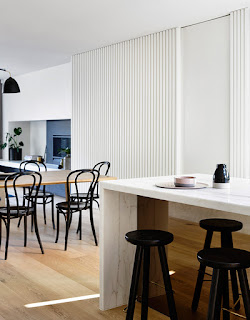 En la planta baja, las áreas de estudio, cocina y estancia fluyen alrededor de un patio central acristalado, que con una escalera de madera adyacente proporciona una fuente de luz central y se enfoca al largo espacio lineal.