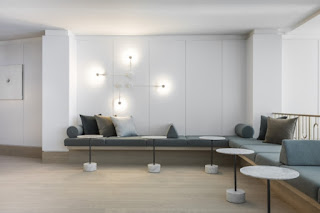 Para el área de recepción del hotel, Michaelis Boyd diseñó una gama de baldosas hidráulicas en azul y blanco. Inspiradas en los tradicionales azulejos holandeses de Delft.