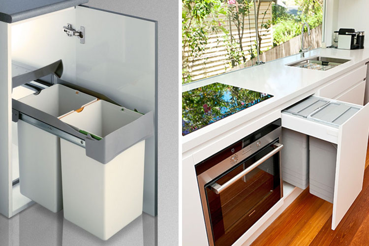 Sin embargo, a los cubos de basura se les suele buscar hueco dentro de uno de los muebles de cocina, generalmente bajo el fregadero. Pero no siempre es posible, especialmente en las cocinas pequeñas.