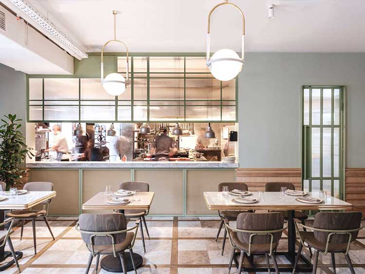 Los cada vez más de moda separadores o ventanales con carpintería de cuarterones, no podían faltar en este restaurante ecléctico donde la conjunción de elementos es la máxima de este estilo decorativo.
